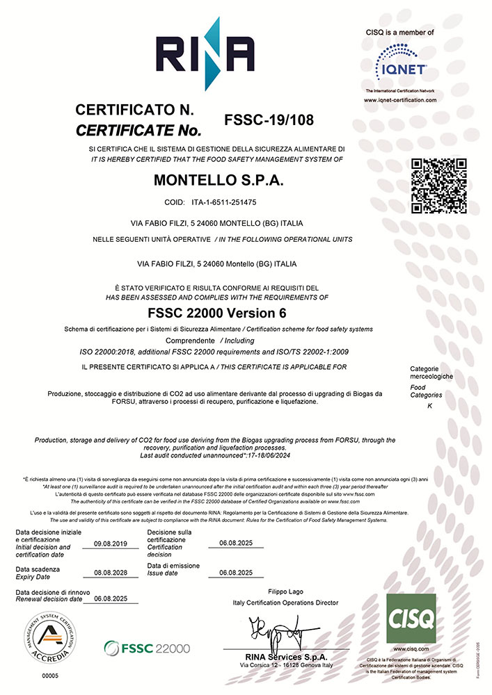 Montello S.p.A. ha conseguito negli anni le certificazioni ISO 9001, ISO 14001, ISO 45001, ISO 50001 e ISO 27001.